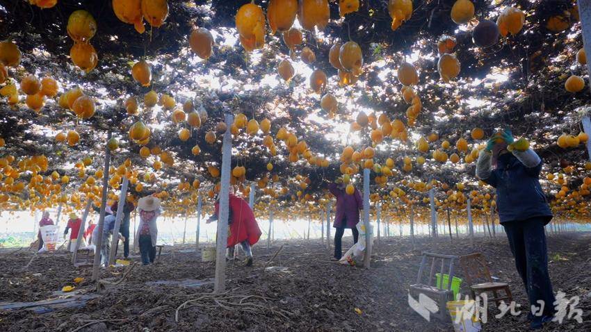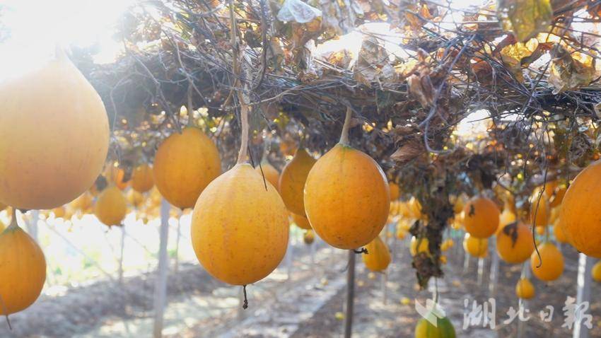 湖北日报客户端讯(通讯员欧阳君、范云杰)时值仲冬,钟祥市柴湖镇黄岔堤村的百亩高标准瓜蒌种植基地迎来丰收。藤架下,金黄色的瓜蒌如灯笼般垂挂,正忙着采收瓜蒌籽的农户们,脸上满是喜悦。