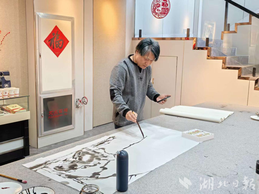 随后,艺术家们走进黄冈市美术馆,在观摩展览后即兴开展书画创作交流,以笔墨丹青传递情谊,展现艺术风格的碰撞与融合。