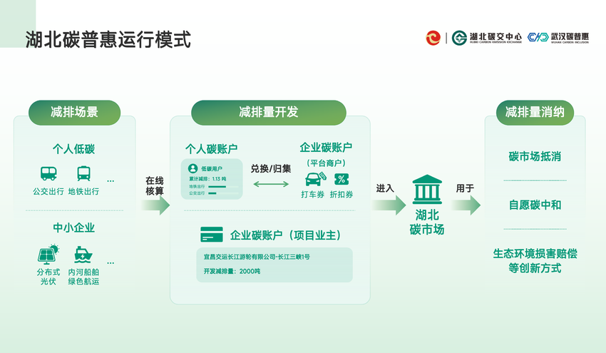 “用户低碳行为产生的减排量由手机第三方平台化零为整,归集后接入‘武碳江湖’统一申报核算。”武汉碳普惠管理有限公司董事长刘树介绍,作为回馈,滴滴出行、支付宝、e充电等向用户提供与减排量等值的优惠权益,实时到账,让低碳出行的兑现触手可及。碳市场交易中心再定期与这些互联网平台进行集中交割。