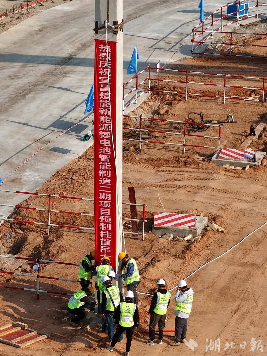 湖北日报客户端讯(通讯员金晓燕、张国荣)12月9日上午,在湖北省宜昌市夷陵区龙泉镇,随着楚能新能源宜昌80GWh全新一代锂电池项目(楚能二期)工地响起清脆哨音,一根重达9.5吨、高10米的预制柱被缓缓吊起,在现场工人精准指引下,稳稳嵌入预埋套筒。首批预制柱成功吊装,标志着该项目正式从地下基础施工迈入地上主体结构建设阶段,为刷新“宜昌速度”再添新注脚。