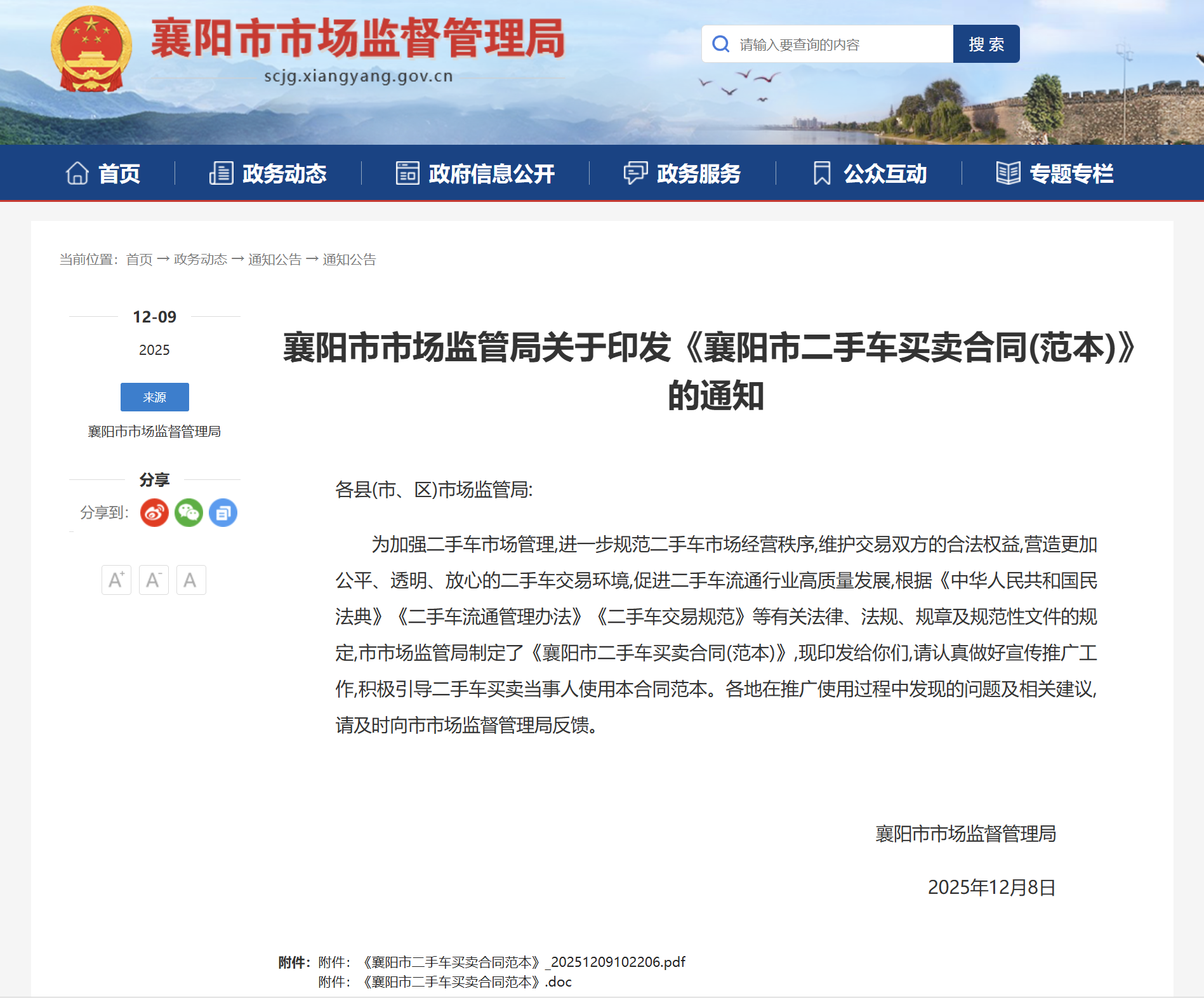 12月8日,襄阳市市场监督管理局正式发布《襄阳市二手车买卖合同(范本)》。