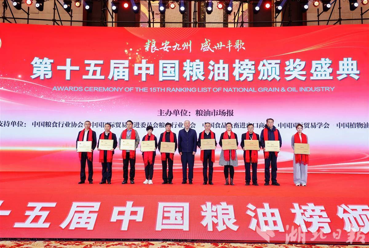 湖北省粮油集团有限公司入选“中国十佳粮油集团”,湖北现代农业集团有限公司荣获“粮安中国杰出贡献奖”,湖北省粮油食品进出口集团有限公司、武汉明乔科技有限公司双双获评“中国粮油乡村全面振兴引领企业”,宜昌粮食集团有限公司、当阳市民天米业有限责任公司一同跻身“中国十佳粮油高质量发展典范企业”。湖北康宏粮油食品有限公司“二度梅”、湖北安舜食品工业有限公司“武当花”2个品牌入选“中国十佳粮油(食品)卓越品牌”。