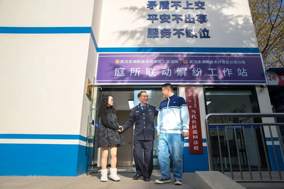 国徽高悬,审判席、公诉席、被告席、辩护席依次排开。在武汉东湖新技术开发区茅店派出所当代社区警务室二楼,这个不大的“速裁法庭”成为化解矛盾的前沿阵地。