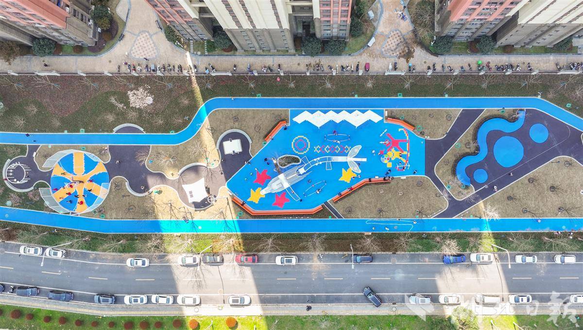 该公园位于武汉市江汉区常青街道,占地面积约1万平方米,是该市首个儿童友好口袋公园。公园以海洋为设计主题,采用海浪、沙滩、鲸鱼等景观元素,色彩鲜艳、充满童趣。