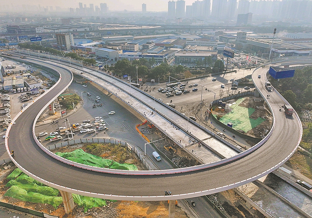 12月8日,施工人员在邓城大道光彩立交桥上安装附属设施。目前该工程已进入最后冲刺阶段,预计本月底实现桥上通车,区域交通效率将显著提升。 (来源:襄阳日报