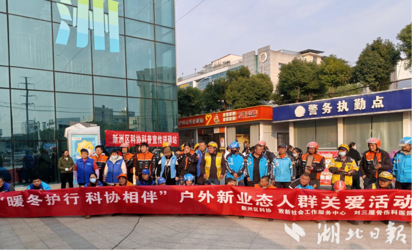 “天越冷越要跑单,没想到能在这里歇脚取暖,还能学到实用的养生知识,太贴心了!”12月11日下午三点半,寒风裹挟着冷意穿梭在新洲区摩尔城的街巷,而一旁的职工户外驿站却暖意涌动。红色的“暖冬护行 科协相伴”横幅格外醒目,志愿者正有条不紊地摆放着暖冬物资,130名网约车司机、快递员、外卖配送员、环卫工等户外新业态劳动者齐聚一堂,搓手呵气间难掩期待。