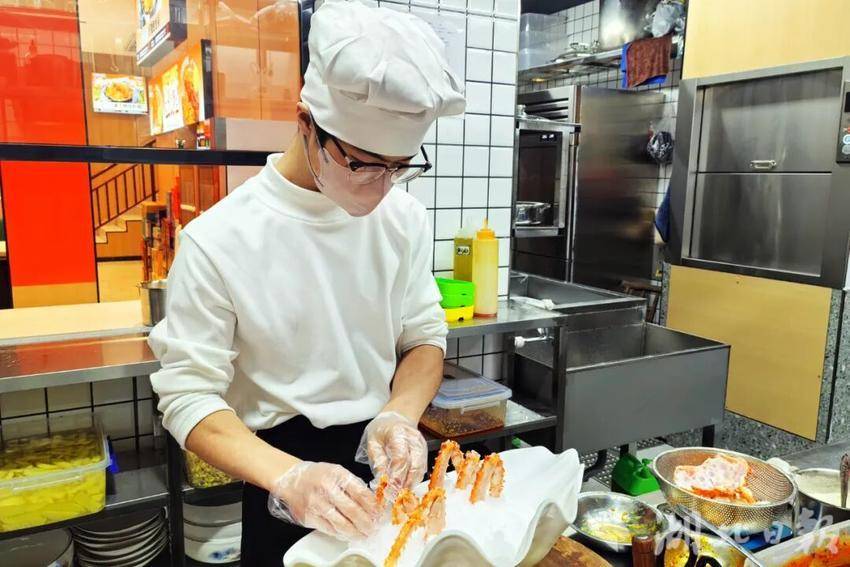 作为店内招牌,帝王蟹堪称“桌桌必点”。食材均从青岛冷链直达,个个色泽红润、个头饱满,经配菜师傅细心处理后,搭配十余种香料精准配比焖制5分钟,收汁后撒上葱花,红亮诱人的帝王蟹鲜气扑鼻。蟹肉Q弹紧实,蘸上蒜泥、香菜、香油调制的秘制蘸料,满口鲜香让人欲罢不能。