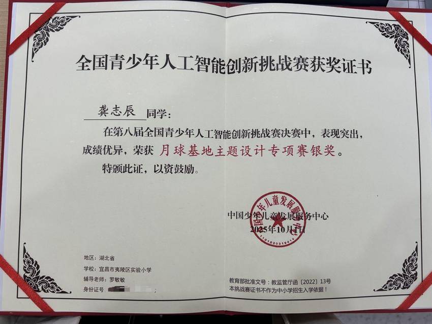湖北日报客户端讯(通讯员蔡龑龑、郭琼瑶)近日,从浙江乌镇机器人竞赛组委会传来喜讯:在2025年教育部“白名单”首项赛事——“全国青少年人工智能创新挑战赛”全国总决赛中,来自宜昌市夷陵区实验小学的龚志辰凭借出色的创新能力和扎实的技术功底,一路过关斩将,最终荣获银奖,实现了夷陵区在该项顶级国家级人工智能赛事中奖项“零的突破”。