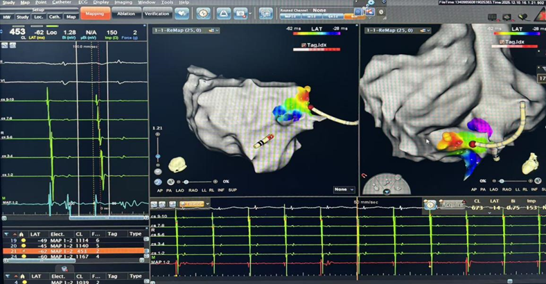 面对如此复杂的病情,十堰市人民医院心血管内科一病区组成范群雄副主任医师、张焕鑫主任医师和曹野博士为核心的介入团队,迎难而上,制定了精细的手术方案:一是针对患者高龄、合并冠脉病变,手术团队必须格外谨慎,确保手术不影响心脏血液供应,避免诱发心肌缺血。二是采用国际先进的CARTO三维电生理标测系统,精确定位房性早搏的起源点,争取“十环”命中目标,首站决胜。三是术后需严密监护,预防穿刺部位出血、血栓形成、心包积液等并发症。