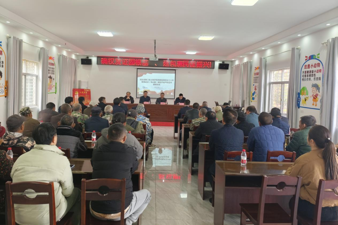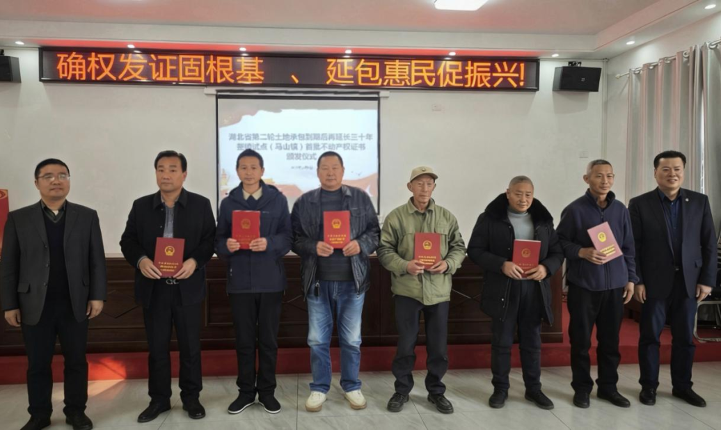 湖北日报客户端讯 (通讯员 赵小旭)12月9日下午,湖北省第二轮土地承包到期后再延长30年整镇试点(马山镇)首批不动产权证书颁发仪式在双龙村举行。市不动产登记中心党委书记、主任龙时元,区委常委、统战部部长王海波,区财政局、马山镇负责人出席仪式,14户农户代表现场领取证书,喜悦之情溢于言表。这一时刻标志着土地承包经营权正式纳入不动产统一登记,也是马山镇深化农村土地制度改革、激活乡村发展动能的关键一步。