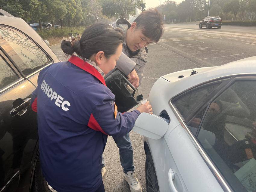 抵达后,易站长熟练地为车辆加注燃油,车辆得以顺利启动。车主连声道谢:“感谢你们来得及时,不然我都不知道要困到什么时候!”随后,在易站长的引路下,该车驶至仙女加油站将油箱补满。