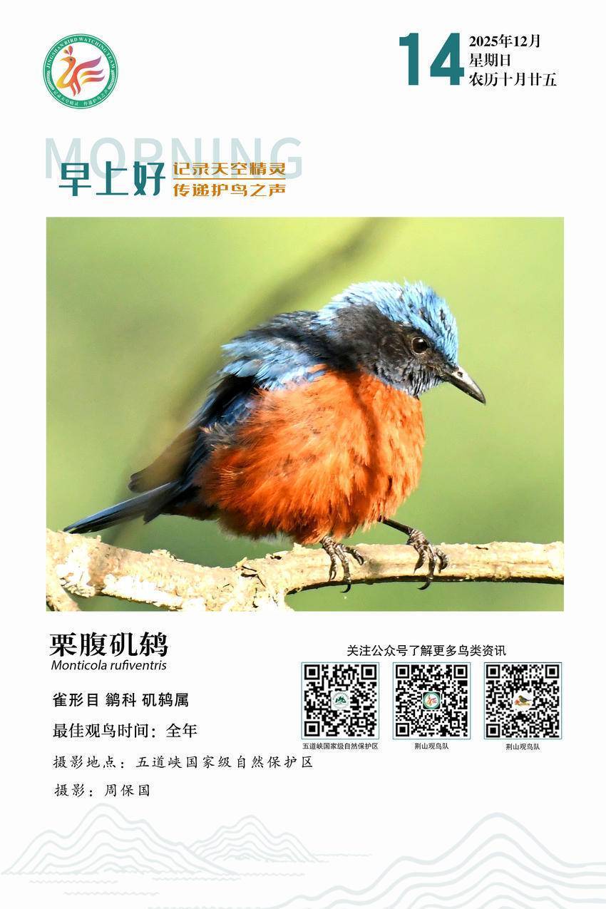 栗腹矶(jī)鸫(dōng)(英文名:Chestnut-bellied Rock Thrush,学名:Monticola rufiventris),是雀形目鹟科矶鸫属的鸟类。体型较大、色彩鲜明。雄鸟头部和背部呈深蓝色,脸部为黑色,腹部为醒目的栗色,雌鸟则为灰棕色,腹部带有明显的鳞状花纹和白色耳后月牙形斑,广泛分布于喜马拉雅山脉至东南亚各国北部。(湖北五道峡国家级自然保护区管理局)