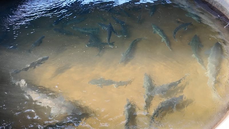 每年12月是鲟鱼销售旺季。“一般能卖出几十万斤,主要销往东三省,其他地区也按需发货。”向涛说。面对鲟鱼对生长环境的严苛要求,楚鲟渔业积累了丰富的实践经验。“喂养要注意水温,超过25℃饲料要减半或几天喂一次,18℃到25℃之间则可正常加强投喂。”此外,企业还通过井水调配、搭建遮阳棚调节水温,并配备专业水质过滤系统与过滤池,确保水体清洁,为鲟鱼健康成长提供坚实保障。