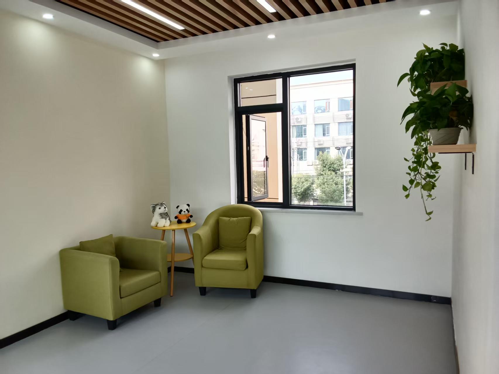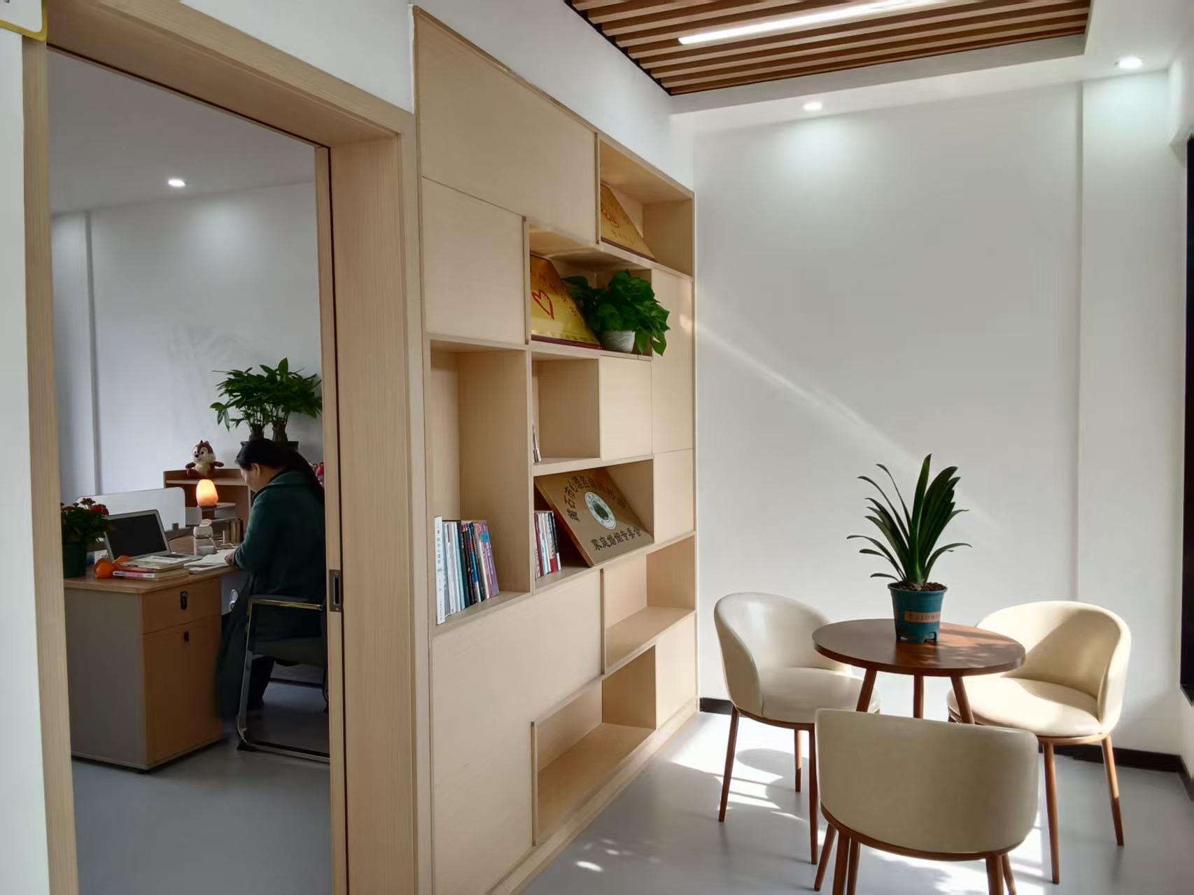 该空间打破了传统功能室的界限设计:一侧配备舒适沙发、抱枕、沙盘与放松训练设备,为个体或团体心理咨询提供专业、安全的环境;另一侧则设有共享书桌、图书角、轻谈区,满足青年学习、交流、社交等多重需求。两区既可独立使用,保障咨询私密性,也可灵活连通,为各类活动提供开放的的互动场域。