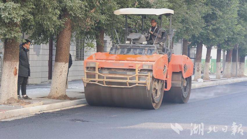 12月16日,在汉川市大兴路的施工现场,机器轰鸣,一派繁忙。装着沥青的大货车,大型压路机来往穿梭,沥青摊铺机匀速前行,将滚烫的沥青均匀铺开,钢轮压路机、皮轮压路机反复碾压,在机械难以完全覆盖的边角区域,工人们手持铁锹、耙子进行精细辅助作业,确保施工质量不留死角。
