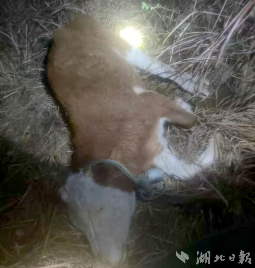 夜幕降临,无人机缓缓升空,在低空领域开展搜索。经过2个多小时的耐心排查,技术人员在距离事发地约5公里的一处山坳芦苇丛中,发现一个异常热源。拉近镜头后清晰可见,正是一头倒地的耕牛——它的牛绳紧紧缠绕在芦苇根部,无论如何挣扎都无法挣脱,只能跪卧在地,气息微弱,看样子已被困多时。