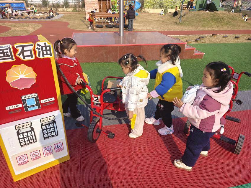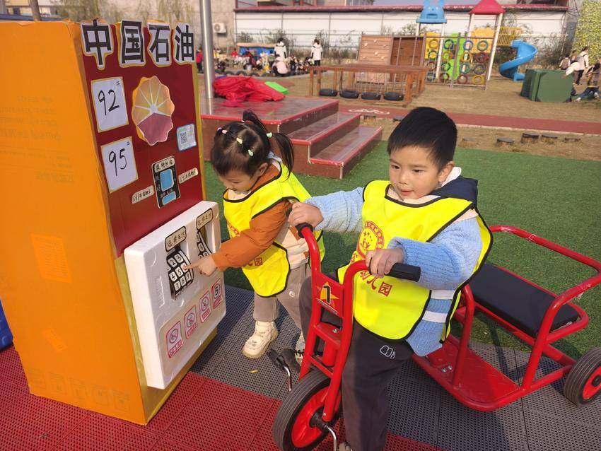 “加油站”里,孩子们穿上亮黄色的工作马甲,手握“油枪”,对着车子油箱口轻轻一按,有模有样地给“小汽车”加油。旁边的“支付机”前,还有小朋友认真地按着数字键,模仿着大人们按键支付的样子,角色扮演得那叫一个投入。