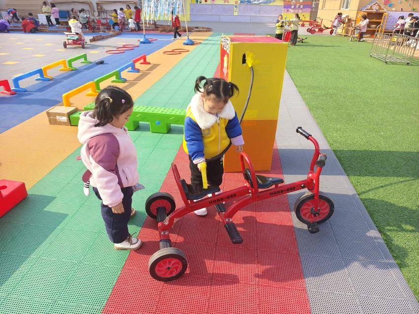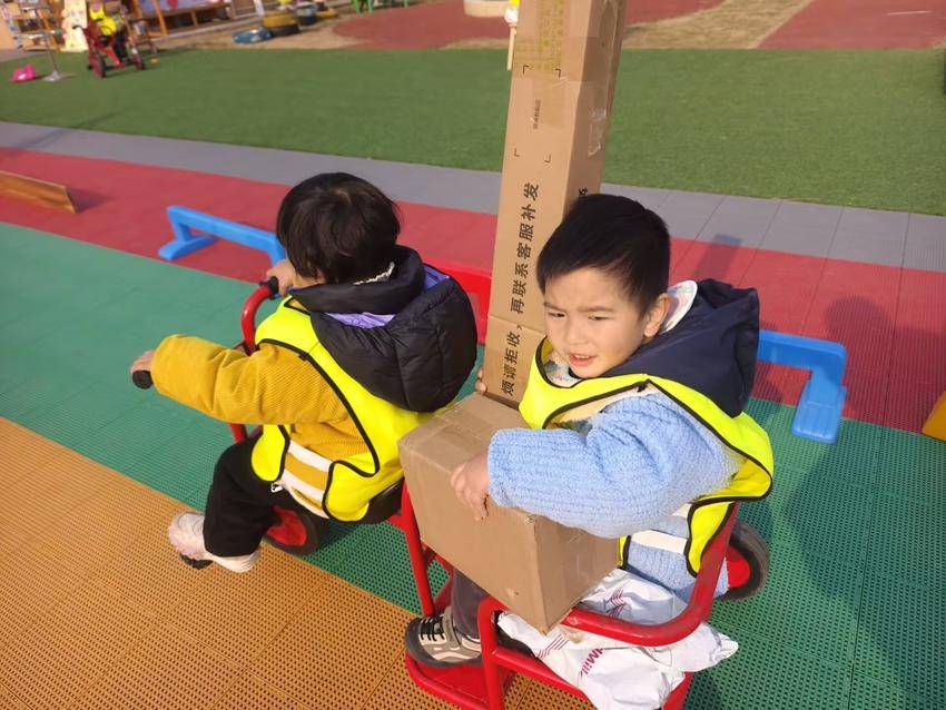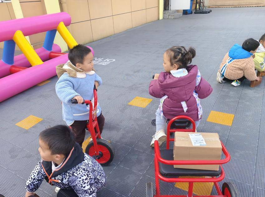 最忙碌的要数“快递员”啦!红色的三轮车上绑着大大小小的纸箱,孩子们骑着车穿梭在骑行区,一边骑一边喊:“快递到啦!”。阳光下,孩子们的笑脸和奔跑的身影成了幼儿园里一道亮丽的风景线。