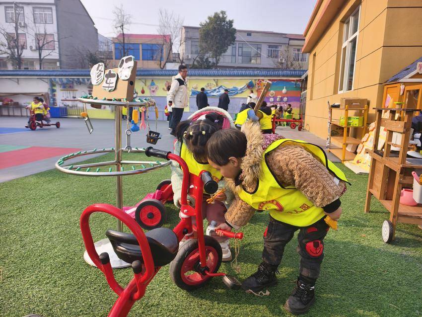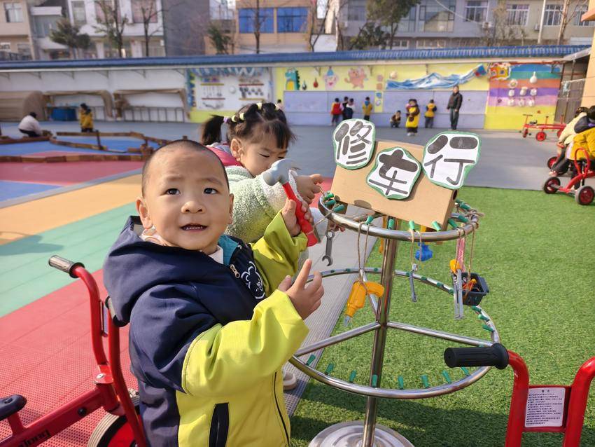 不远处的“修车行”里,有的孩子手拿塑料小锤子,对着三轮车的把手敲敲打打。有的则拿着小扳手,蹲在车旁拧螺丝,仿佛真的在修理故障车辆。“修车师傅”们专注的神情,引得路过的小朋友频频围观,大家你一言我一语地讨论着车子哪里坏了,合作的种子正悄悄发芽。