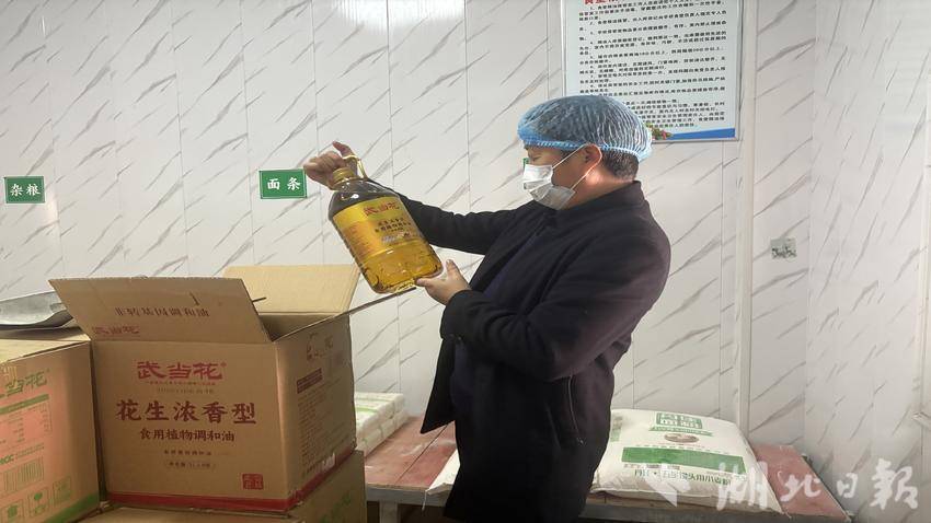 在食堂食材储存间,分类清晰的“油”“杂粮”“面条”区域前,吴督学的检查带着“较真劲”:拿起货架上的“武当花”菜籽油,他凑近核对包装上的质检标识、保质期;翻看袋装面条时,特意拆开包装袋查看封口处的生产日期,确认食材新鲜度。“食材源头是食安第一关,标签、日期一个都不能含糊。”他边查边叮嘱食堂负责人。
