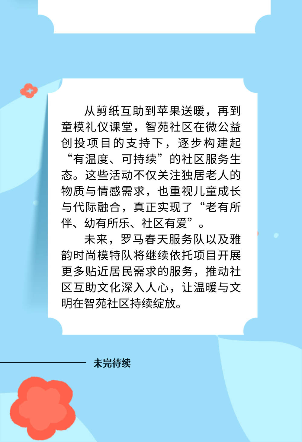 活动中,78岁的独居老人张奶奶在志愿者帮助下剪出一匹“奔腾马”,开心地说:“有人陪着说话、手把手教,这剪纸比看电视有意思多了!”该活动是“一个人的手工坊”项目的延伸,旨在通过手工活动孵化志愿者队伍,为独居老人提供持续性、复合型帮扶。服务队负责人马师傅表示,后续将根据老人需求开展上门手工服务,让温情与文化在社区持续传递。