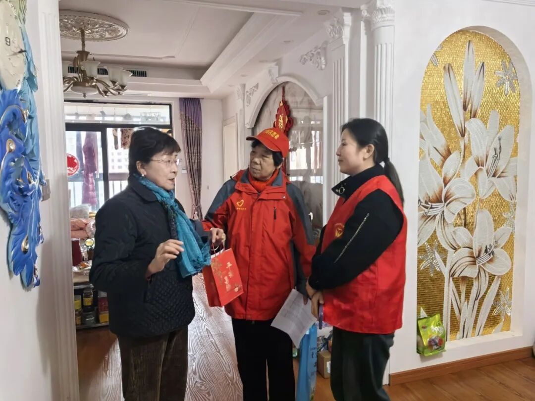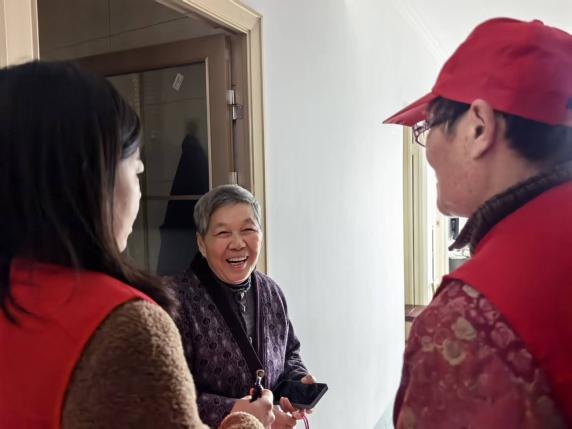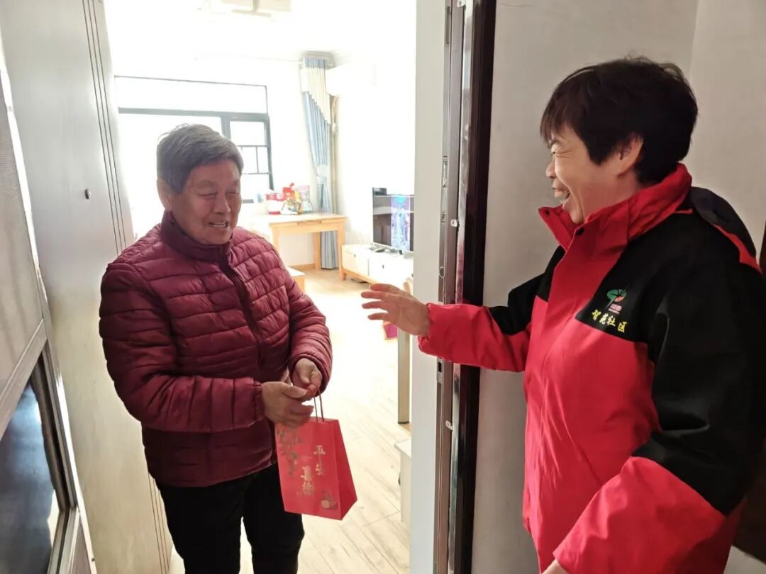 志愿者们逐户上门,与老人亲切交谈,询问其生活与健康情况。86岁的谷爷爷接过苹果后笑容满面:“这苹果红得亮眼,你们的心意比苹果还甜!”此次活动同样是“一个人的手工坊”项目的服务延伸,不仅为老人送去温暖,也增强了社区“邻里互助”的生态,让“助老”逐渐成为社区文化符号。