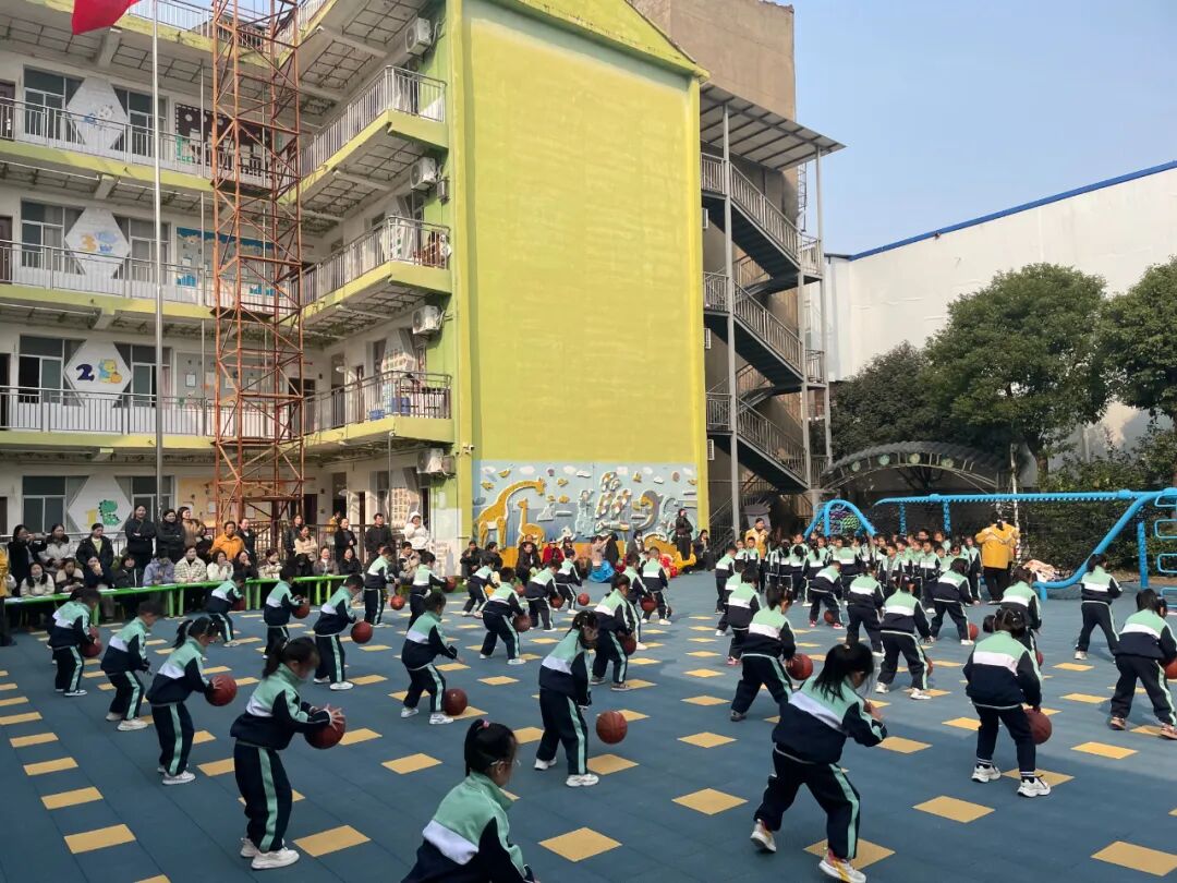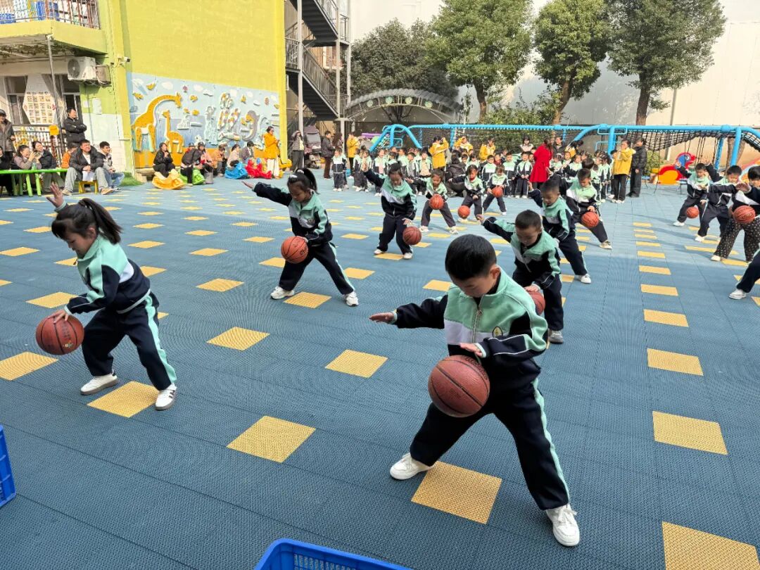 在大班哥哥姐姐在比赛中以篮球为器械,将动感的音乐、整齐的队列、创意的动作巧妙融合,演绎传球、原地单手拍球、双手拍双球、变换队形拍球……篮球在哥哥姐姐们手中玩转自如,时时传出球触地面的“啪啪声”,他们灵活的身姿和熟练的球技,展现出篮球运动独特的魅力。