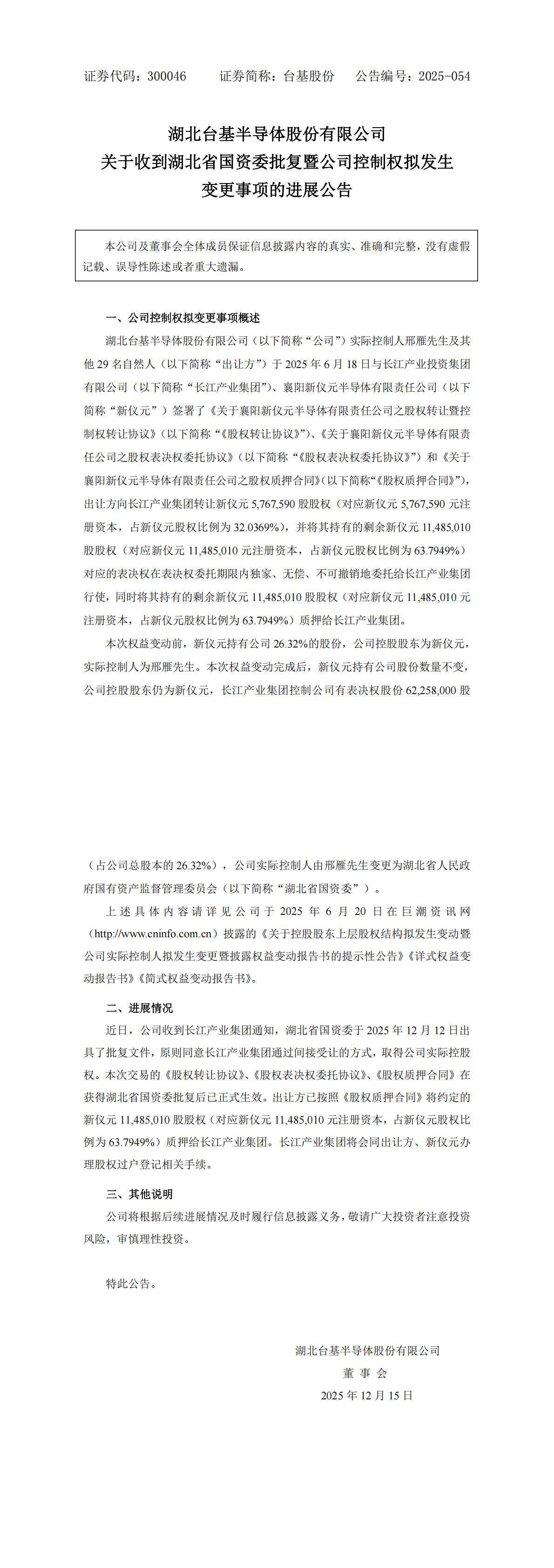 湖北日报讯(记者肖丽琼、通讯员张晶)12月17日获悉,省政府国资委已正式批复,原则同意长江产业投资集团有限公司以间接受让方式取得上市公司台基股份(300046.SZ)的实际控制权。本次收购完成后,长江产业集团控股的上市公司将增至六家,包括广济药业(000952.SZ)、万润科技(002654.SZ)、奥特佳(002239.SZ)、双环科技(000707.SZ)、凯龙股份(002783.SZ)以及台基股份(300046.SZ),业务覆盖光电子、汽车、生物医药、现代化工等重点行业。