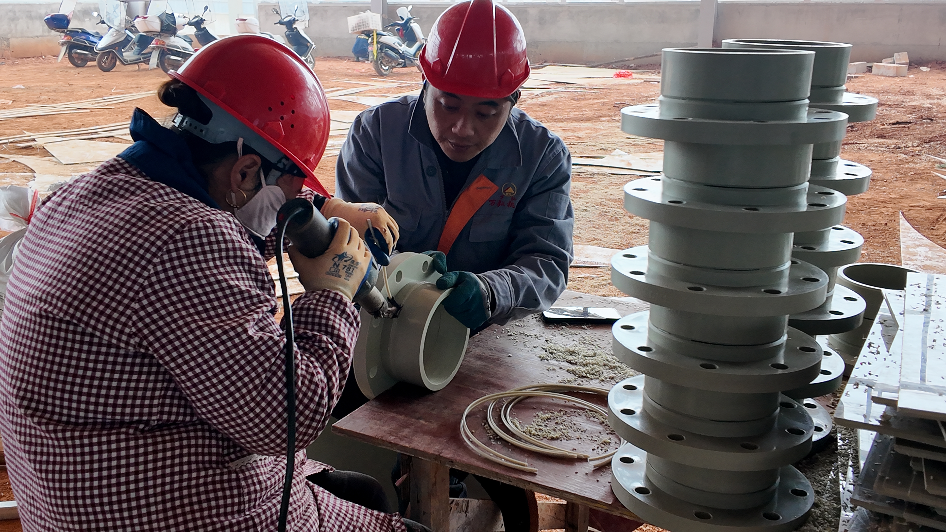 工人正在加工管道连接组件。(湖北日报全媒记者 肖露 摄)
