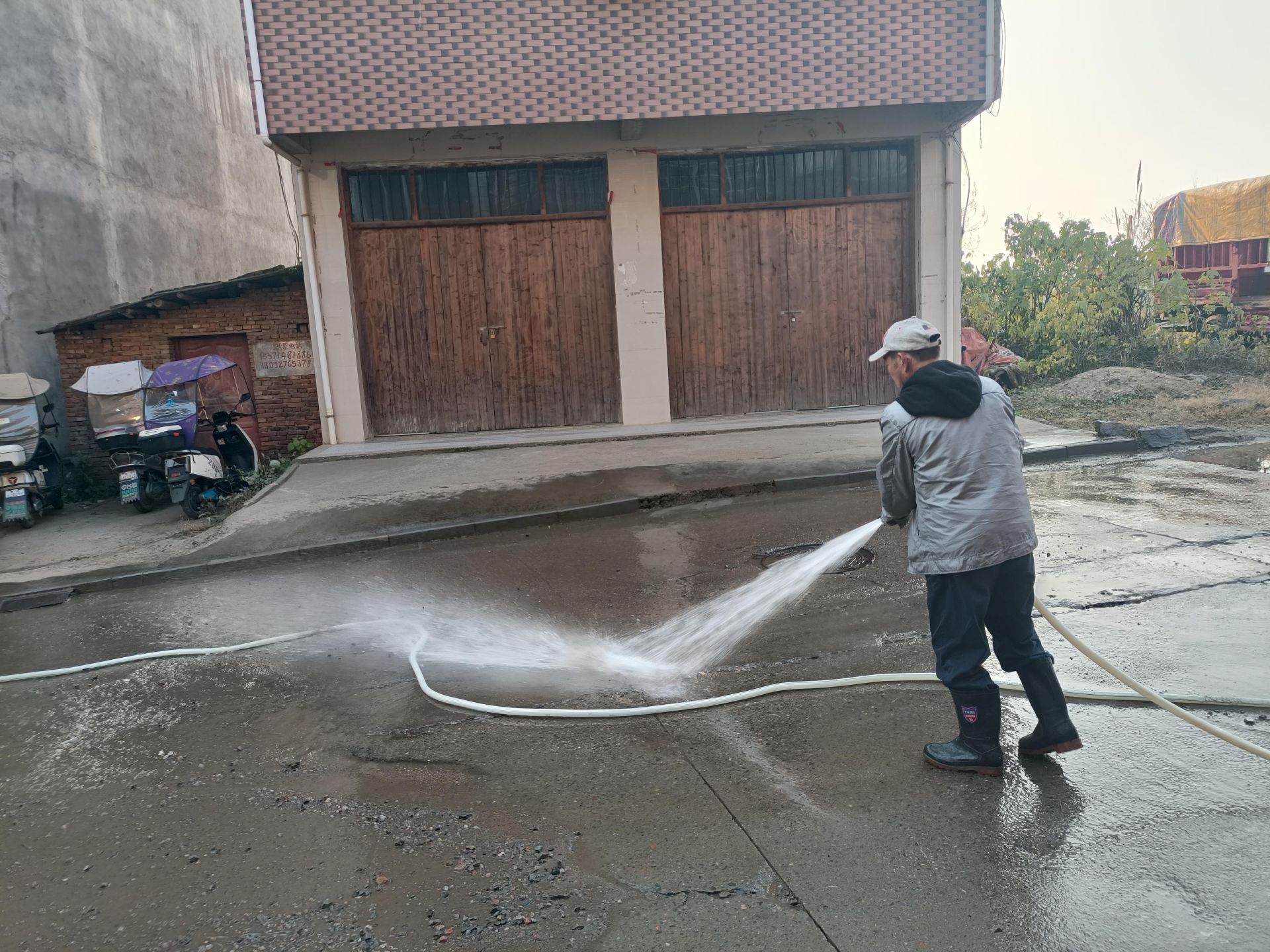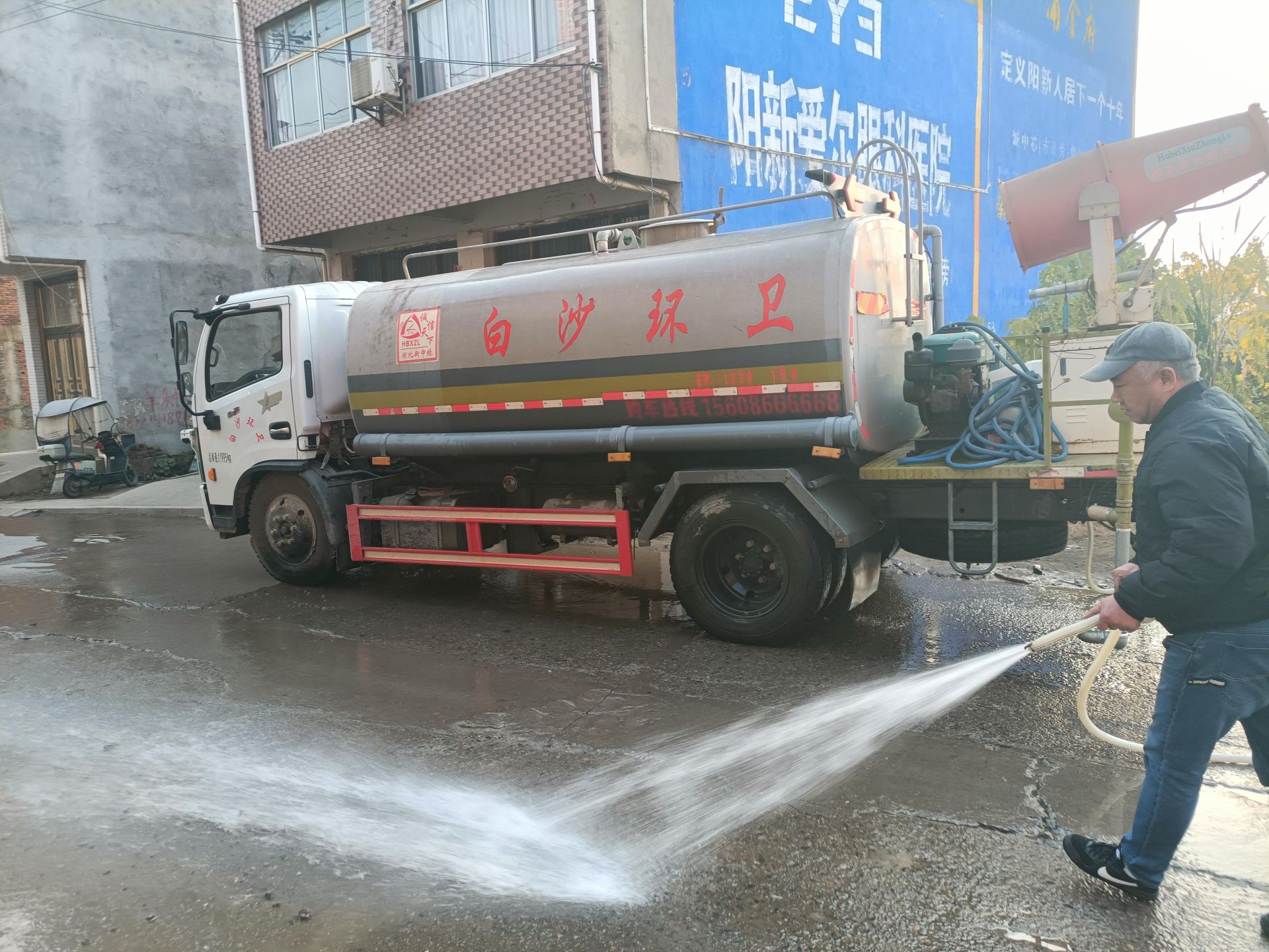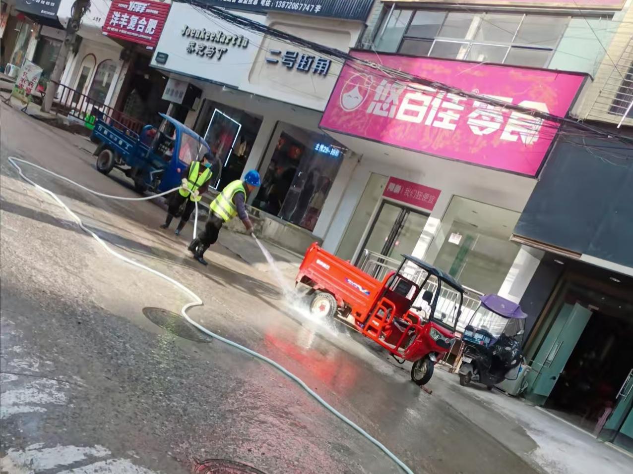 湖北日报客户端讯(通讯员姜孝康)12月17日早上,阳新白沙镇的环卫洒水车来到镇区七峰路,用人工方式对路面进行冲洗,得到了沿街居民纷纷点赞。