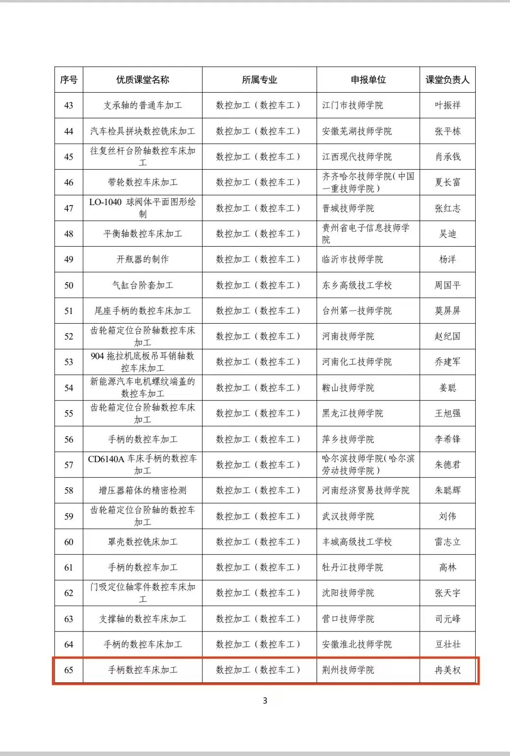 近日,人力资源社会保障部办公厅发布《关于公布技工院校工学一体化技能人才培养模式优质课堂名单的通知》,荆州技师学院申报的”数控加工(数控车工)——手柄数控车床加工”课题,历经院校自主申报、省级集中遴选、部级统筹审核等环节,成功入选技工院校工学一体化技能人才培养模式优质课堂名单。