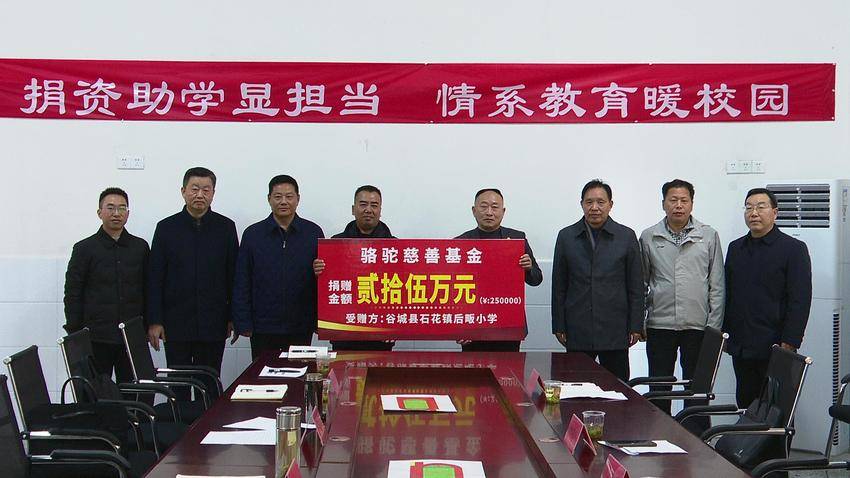 湖北日报客户端讯(通讯员田强)捐资助学显担当,情系教育暖校园。12月19日,骆驼集团股份有限公司向谷城县石花镇后畈小学捐赠25万元,用于支持后畈小学教育事业发展。襄阳市红十字会党组书记叶建斌,县人大常委会副主任张朝学参加捐赠仪式。