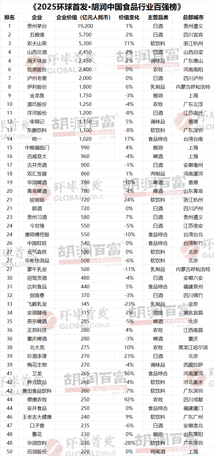 胡润研究院第五次发布中国食品行业百强榜