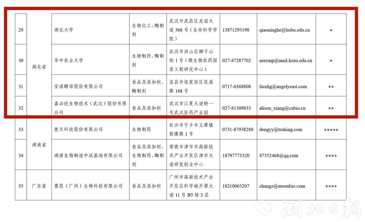 湖北日报讯(记者李玉麟、通讯员吴珊)工业和信息化部官网消息,根据《关于开展生物制造中试能力建设平台培育工作的通知》(工信厅联消费函〔2025〕234号),经省级主管部门推荐、专家评价、面向社会公示等程序,工业和信息化部办公厅于12月16日印发《生物制造中试能力建设平台名单(第一批)》。首批名单全国共有43个平台入选。我省湖北大学、华中农业大学、安琪酵母股份有限公司、嘉必优生物技术(武汉)股份有限公司4家单位榜上有名,入选数量位居全国第一梯队。