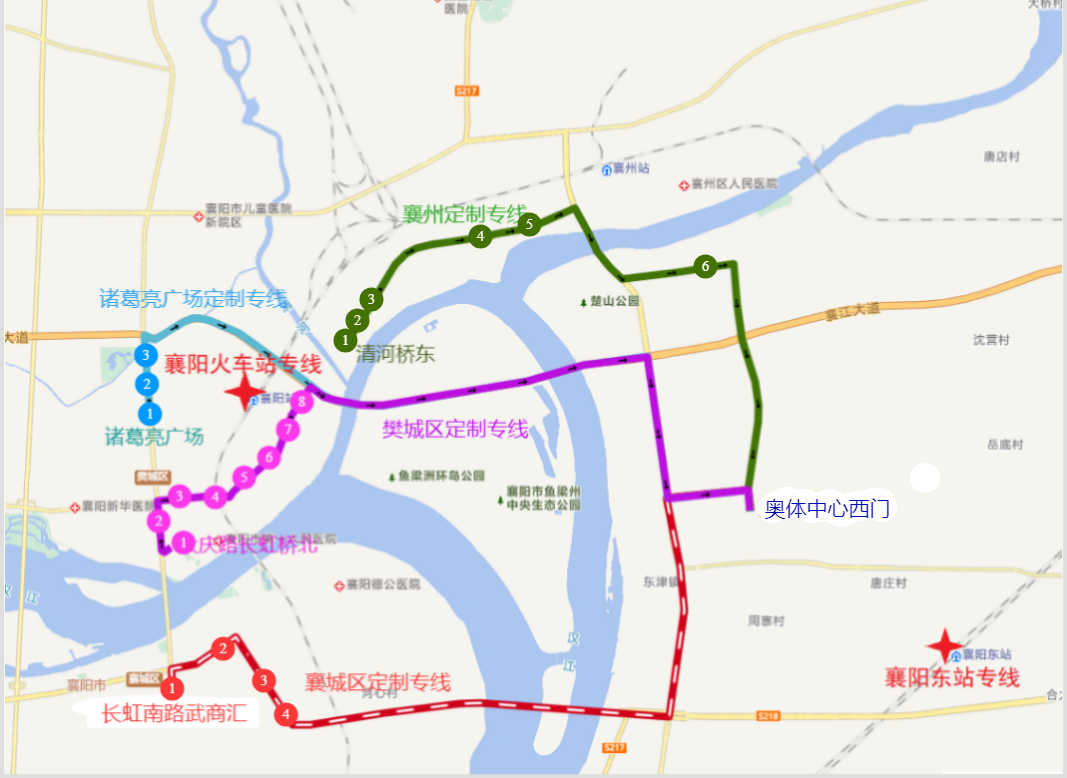 襄城定制专线由长虹桥南武商汇(原襄城客运站)发车,沿途停靠长虹南路武商汇、古城十字街、南湖广场、胜利街4个站点,全程35分钟;