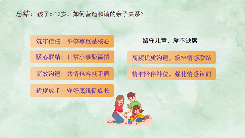 黄老师结合典型案例,剖析了家庭教育中常见的误区,阐释了6-12岁儿童的心理需求及其在亲子关系中的重要性,并重点就“如何营造和谐亲子关系”提出建议:以平等尊重为核心,在日常小事中积累温情,以共情包容化解矛盾,在守住底线中促进成长。她还特别关注留守儿童家庭,强调“爱不缺席”的陪伴意义。