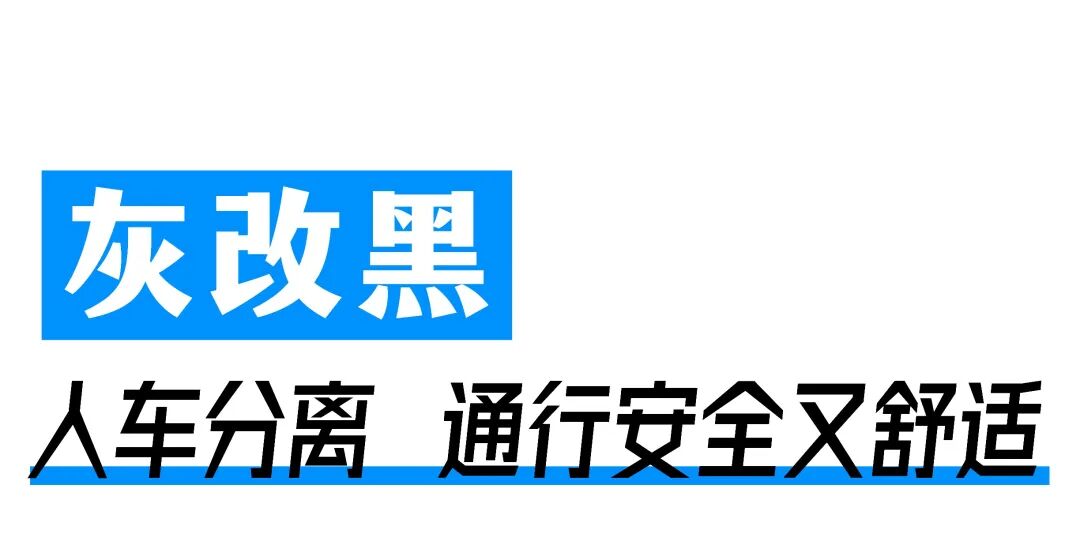 道路工程实施“灰改黑”,“人车分离”让通行更安全更舒适。全线机动车道加铺10cm沥青混凝土,提高行车安全度与舒适度。人行道修复变形下沉、拱胀凸起等问题,面砖更换为灰色厚仿石PC砖。