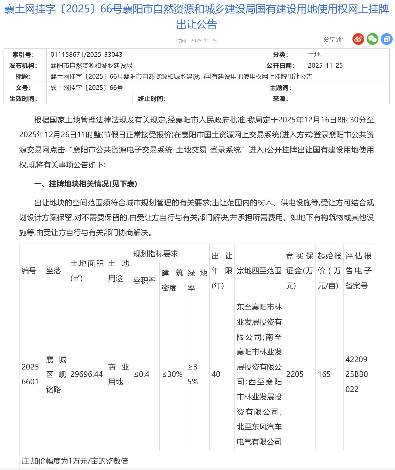 12月16日,襄阳市自然资源和城乡建设局公开挂牌出让襄阳岘山一国有建设用地使用权,并附有林下空间使用权一并出让。