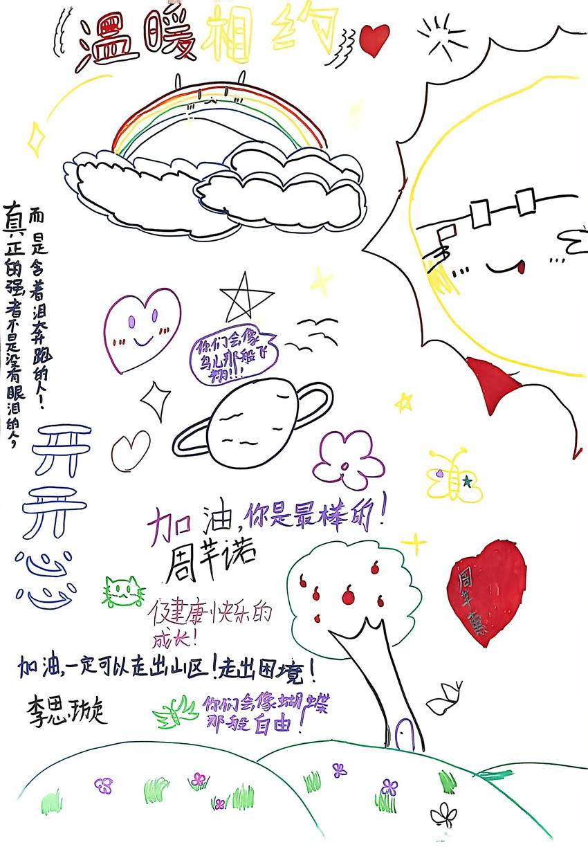 随后,以小组为单位的分组创作环节将气氛推向高潮。孩子们在家长和大学生志愿者的陪伴与鼓励下,化身为“创意小画家”,共同在一幅幅大白纸上绘制“给老河口小朋友的寄语画”。画笔下,有绚烂的彩虹、手拉手的小人、象征希望的太阳,每一笔色彩都承载着他们对远方小伙伴的关怀与祝福。
