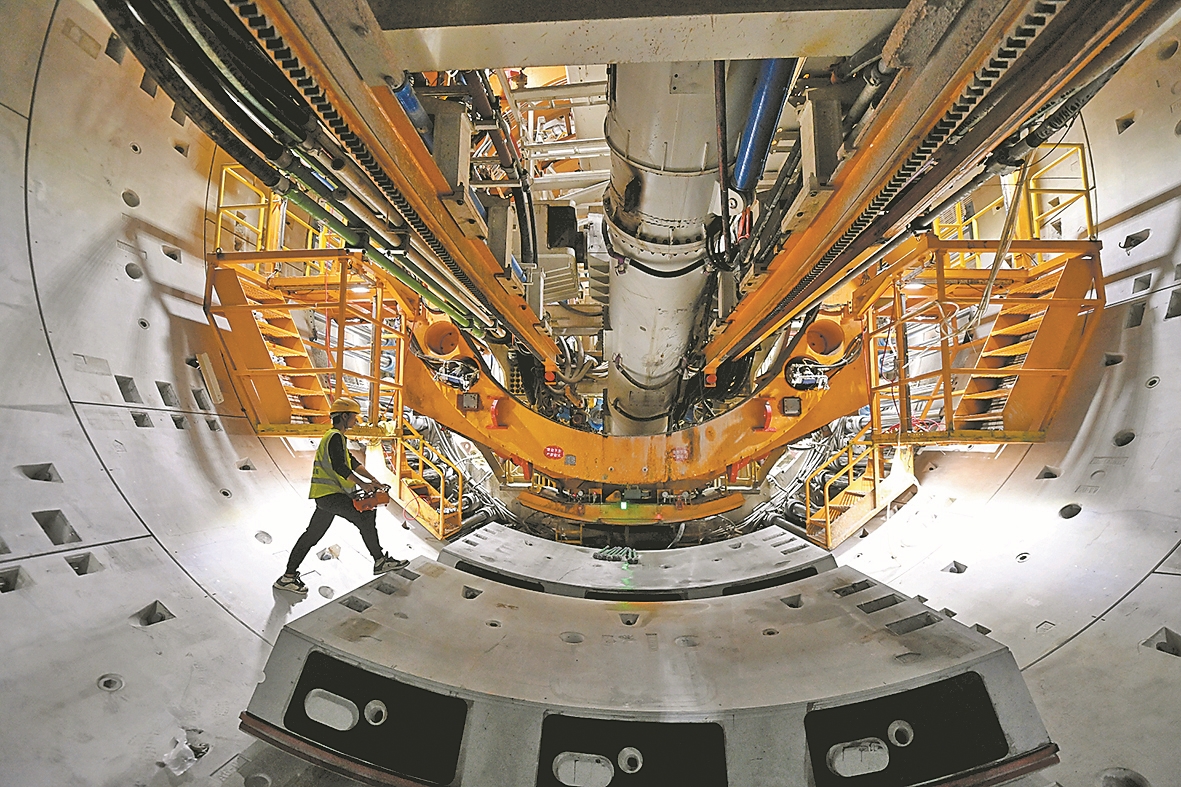 12月3日,在引江补汉工程(谷城段)输水隧洞,工人在掘进机内安装管片。(来源:襄阳日报