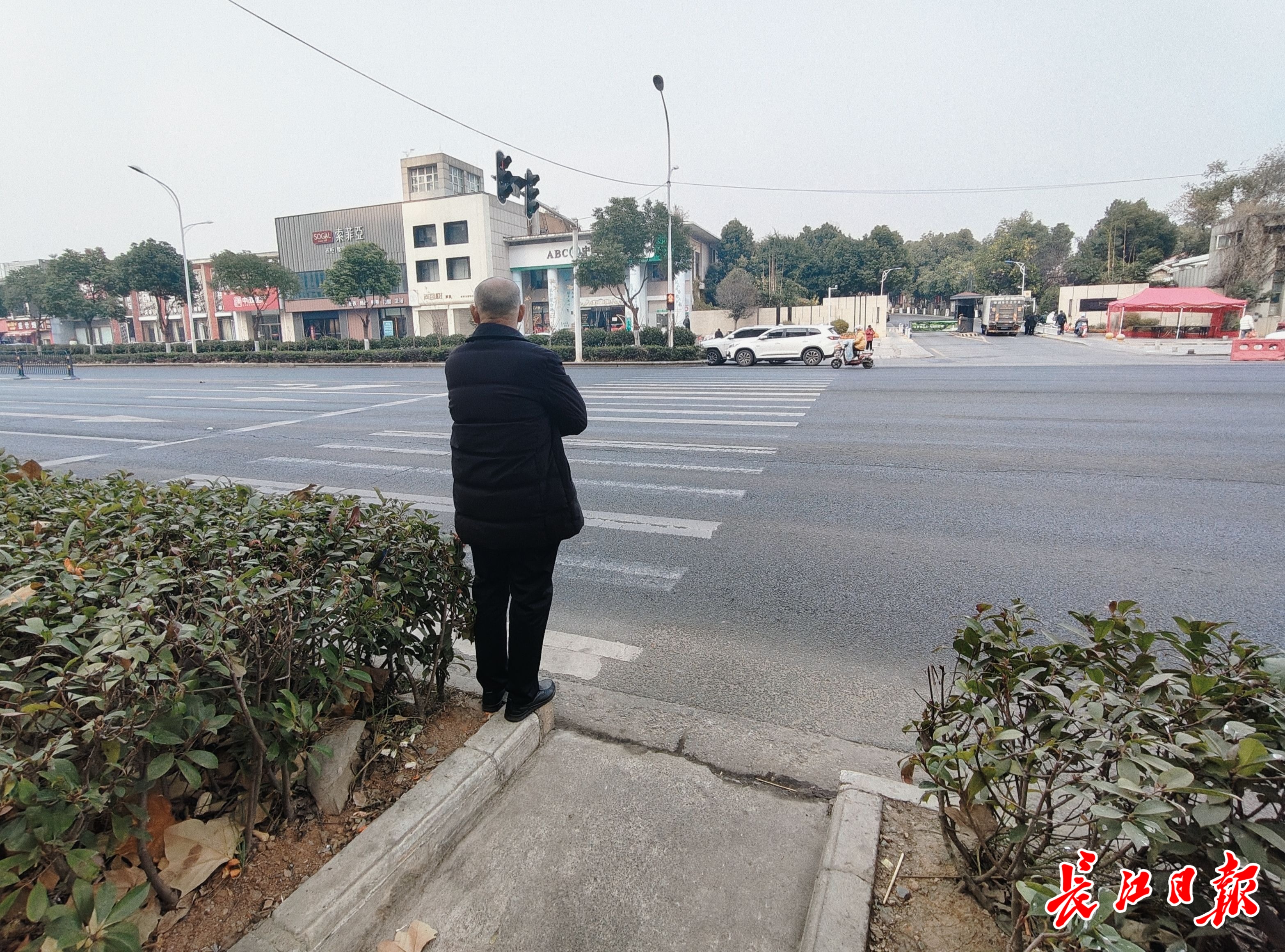 市民在绿化带中等候过马路。记者许魏巍 摄