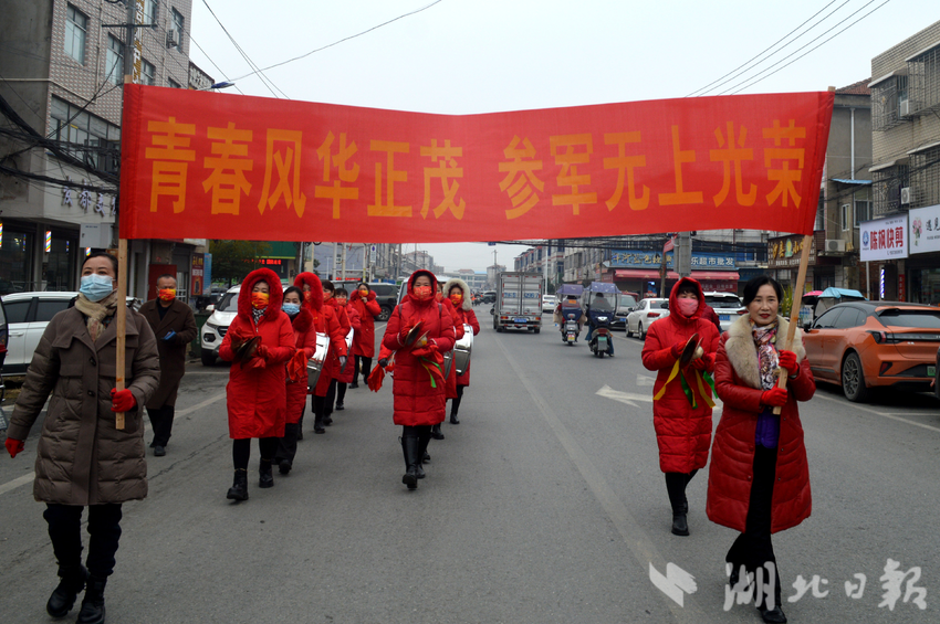 湖北日报客户端讯(通讯员李国新)12月24日,汉川市分水镇城区锣鼓喧天,热闹非凡。23名分水文艺志愿者高举“青春风华正茂 参军无上光荣”的宣传横幅,穿梭于大街小巷,开展2026年义务兵征兵宣传活动,吸引了大量居民驻足关注。