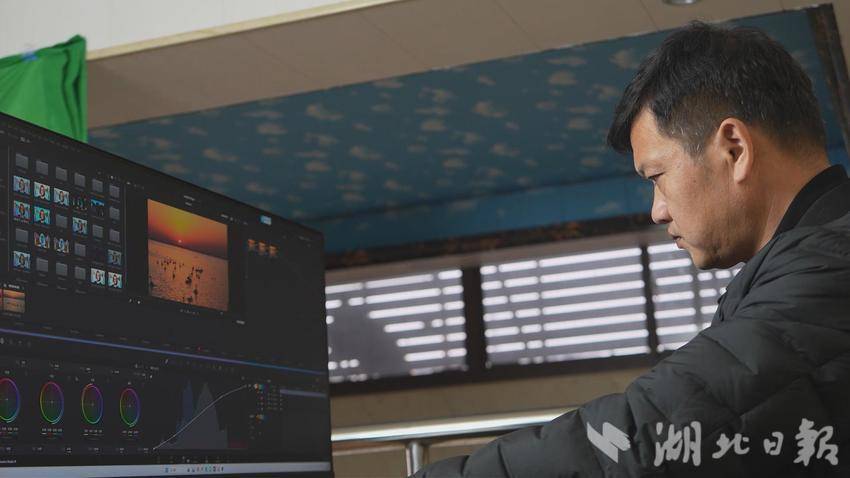 走进汉川鑫城文化传媒有限公司,马金华正与团队围坐讨论。他专注地审看视频素材,指尖划过一幕幕家乡风景与活动画面,细致打磨每一处文案。