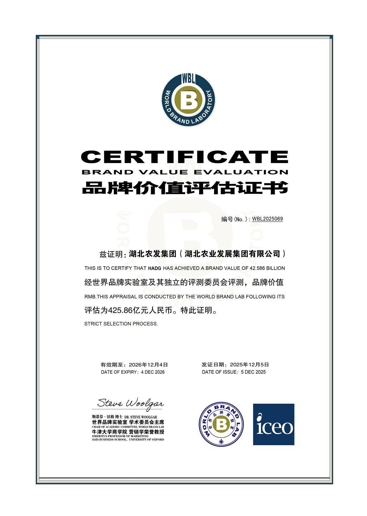 国际权威机构世界品牌实验室发布评估,湖北农发集团品牌价值达425.86亿元