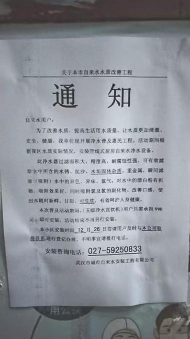 近年来,武水集团多次接到市民咨询,反映有多家名称冠以“武汉自来水”前缀的企业,在小区内张贴“水质改善工程”通知,或以登门拜访、派发传单等方式,推销质次价高的净水设备。这些“李鬼”公司假借国企名义开展营销,极具欺骗性,严重损害市民切身利益与企业品牌形象。