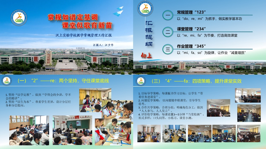 “独行快,众行远。”常规管理的优化,离不开思想的碰撞与经验的共享。活动最后,汉上教联体成员校校长围绕“教学常规管理”主题展开汇报:从“精细化备课管理”到“分层作业设计”,从“教研组协同机制”到“青年教师培养方案”,各校既分享了“规定动作”的落实妙招,也展示了“自选动作”的创新探索。“常规如谱定基调 课堂似歌育新苗”,汉上实验学校校长的发言引发共鸣,这场汇报不仅是工作的总结,更是未来的约定——四校将以此次活动为起点,共享标杆案例,共解常规难题,让规范的常规管理成为四校协同发展的“助推器”。