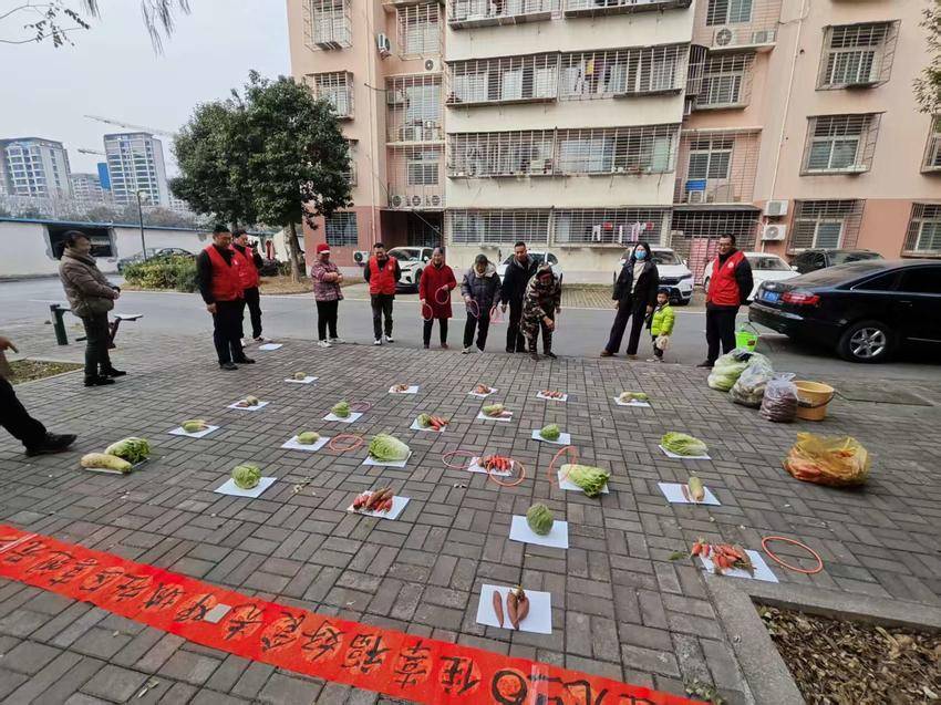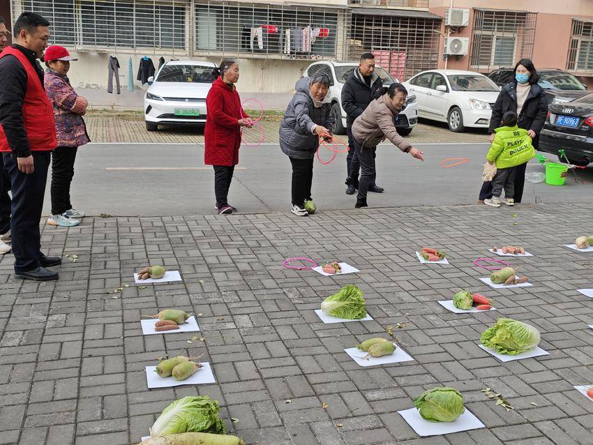 社区工作人员与志愿者们提前采购了新鲜多样的食材,整齐排列在活动现场,色彩鲜亮的蔬菜既透着生活气息,也承载着社区对居民的美好祝福。活动中,居民们有序排队领取套圈,每人手持5个彩色圈环,脸上洋溢着期待的笑容。