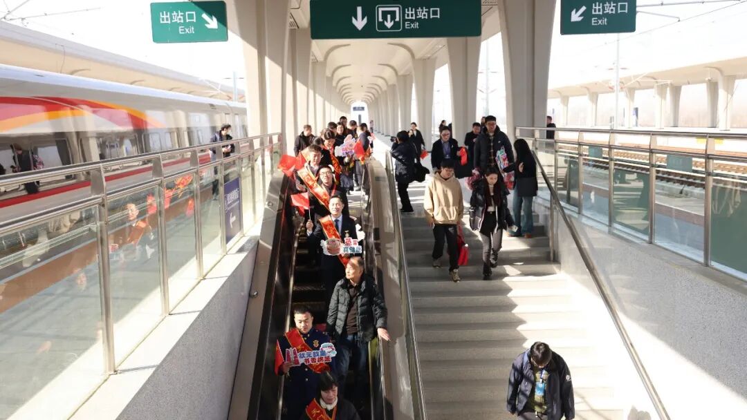 走出站房,锣鼓喧天、人潮涌动的站前广场,气氛更加热烈。