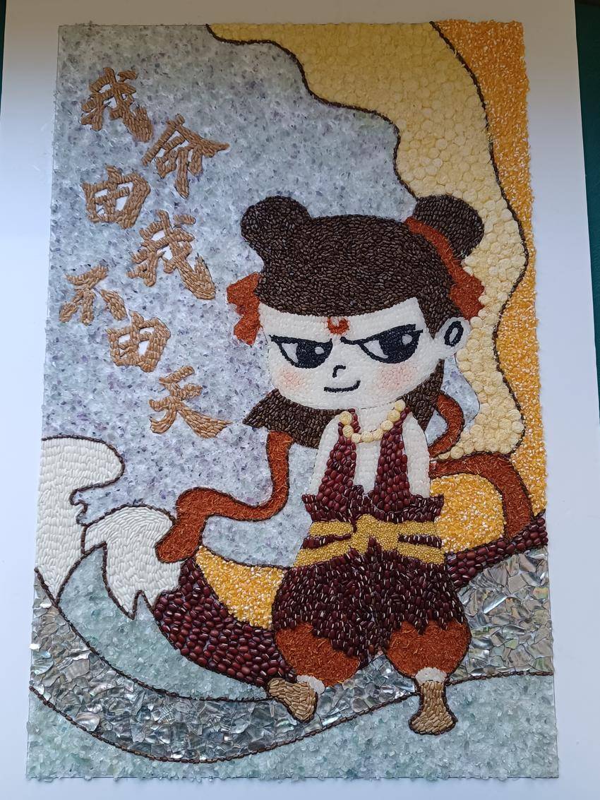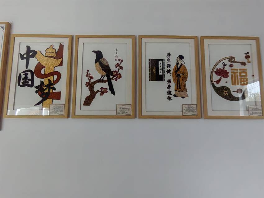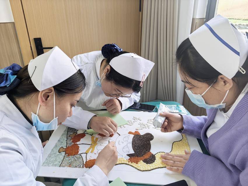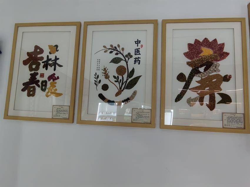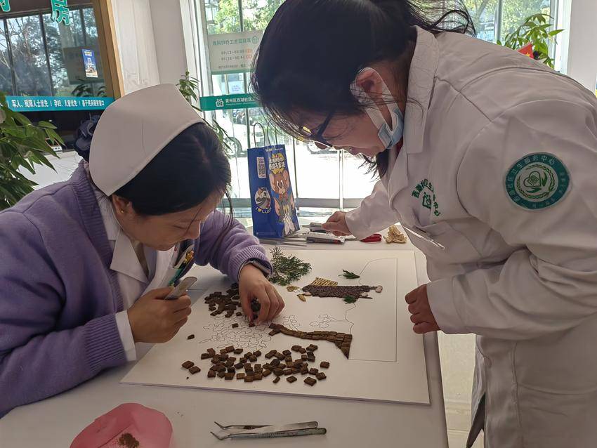比赛现场,药香淡淡,气氛轻松。来自各科室的医护人员利用休息时间,用桑叶、枸杞、菊花、陈皮等药材进行贴画创作。综合科用黄芪、决明子拼出“福”字图,儿保科以贝母、红豆呈现可爱的哪吒形象,惠民站用红枸杞与黑豆组成“喜上眉梢”,行管后勤科则以菊花、金钱草等贴出“中医五行图”。每一幅作品都兼具美感与中医药内涵。