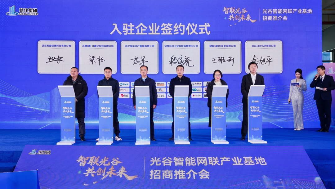 现场,葛化华祥(光谷)绿色化工产业研究院、智能网联产交融合光谷实训基地揭牌,武汉白圭化学有限公司、霍能(湖北)实业有限公司、志德(厦门)真空科技有限公司等5家企业进行意向入驻签约。